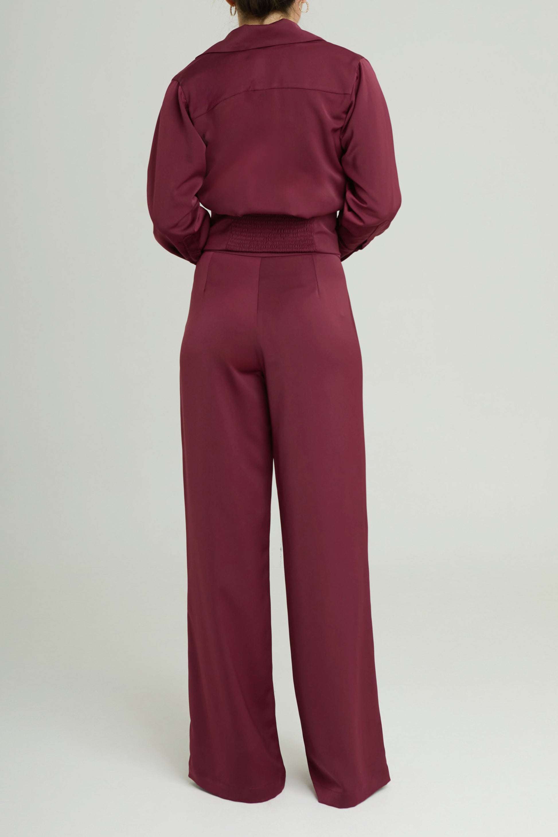 Pantalon de talle alto con cintura estructurada en forma de “V” y bota ancha, confeccionados en un tejido fluido que cae con elegancia. Trae unas venas frontales sutiles que estilizan la silueta y aportan un acabado pulido.