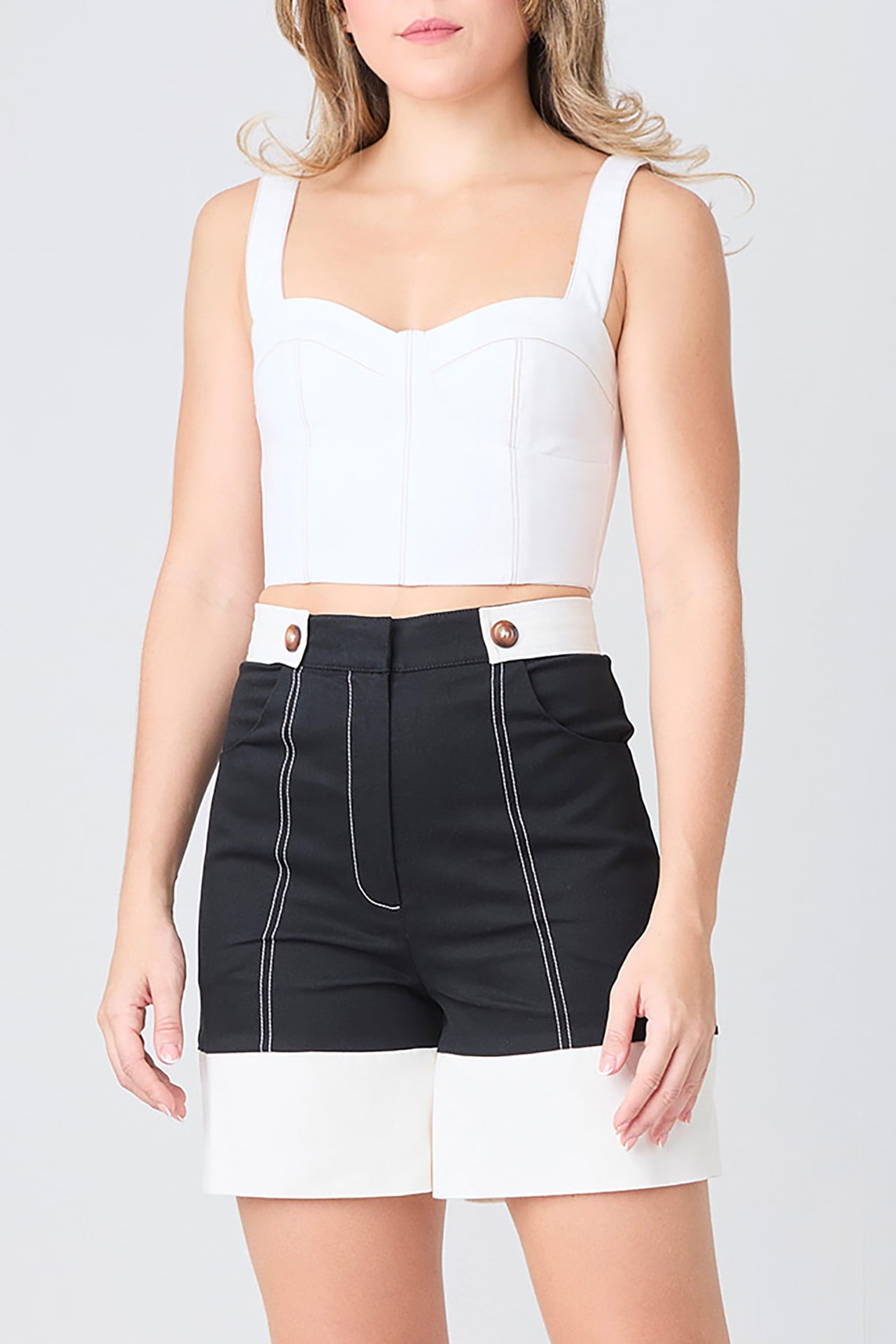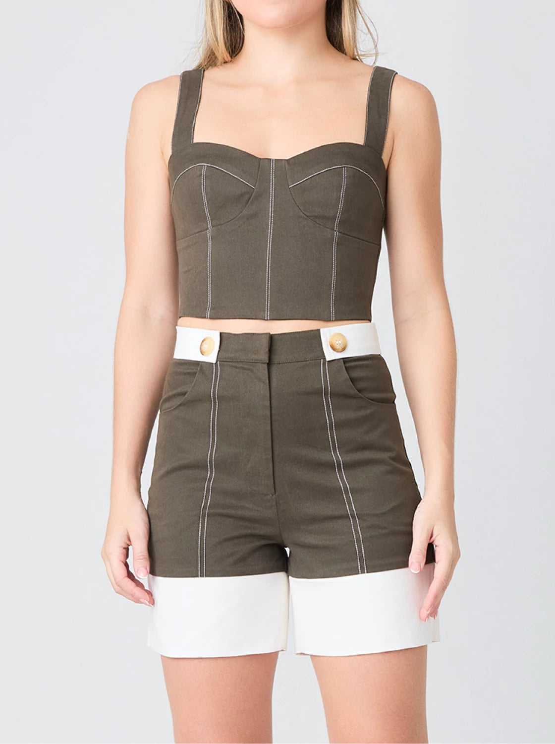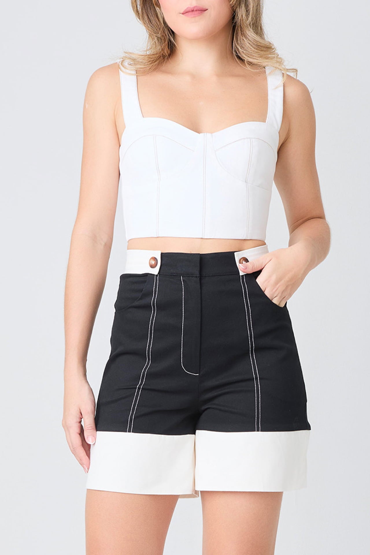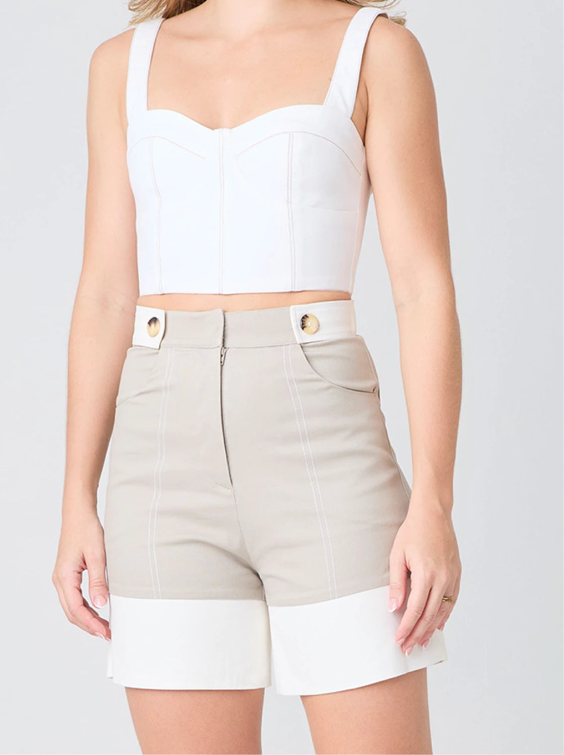 Nuestro Best Seller pantalón farrah ahora en versión short. Con su corte insignia en la bota blanca, con pespuntes dobles en contraste blancos, detalles de tiras con botones de carey en la pretina y bolsillos para utilidad. Con un cierre de agarre interno y corredera de Poliéster.