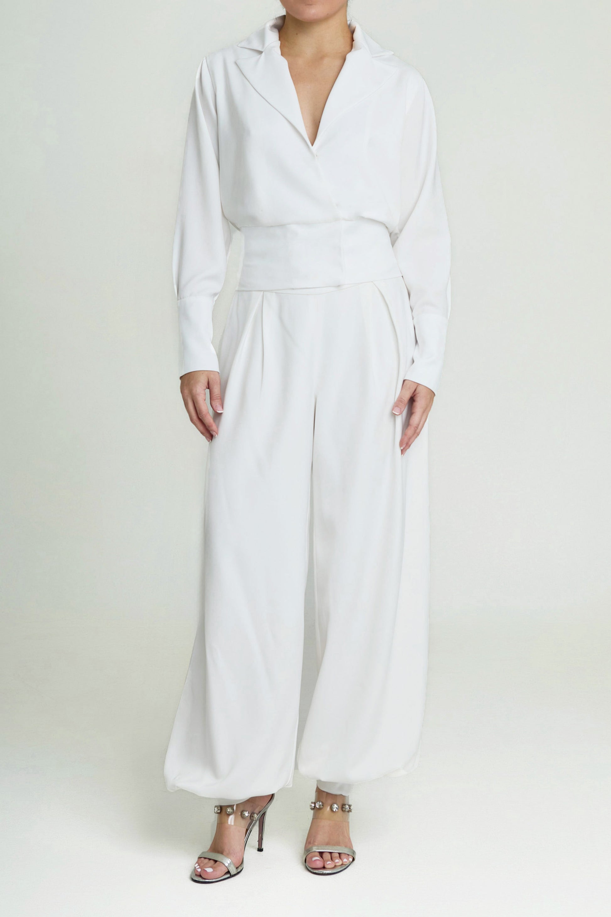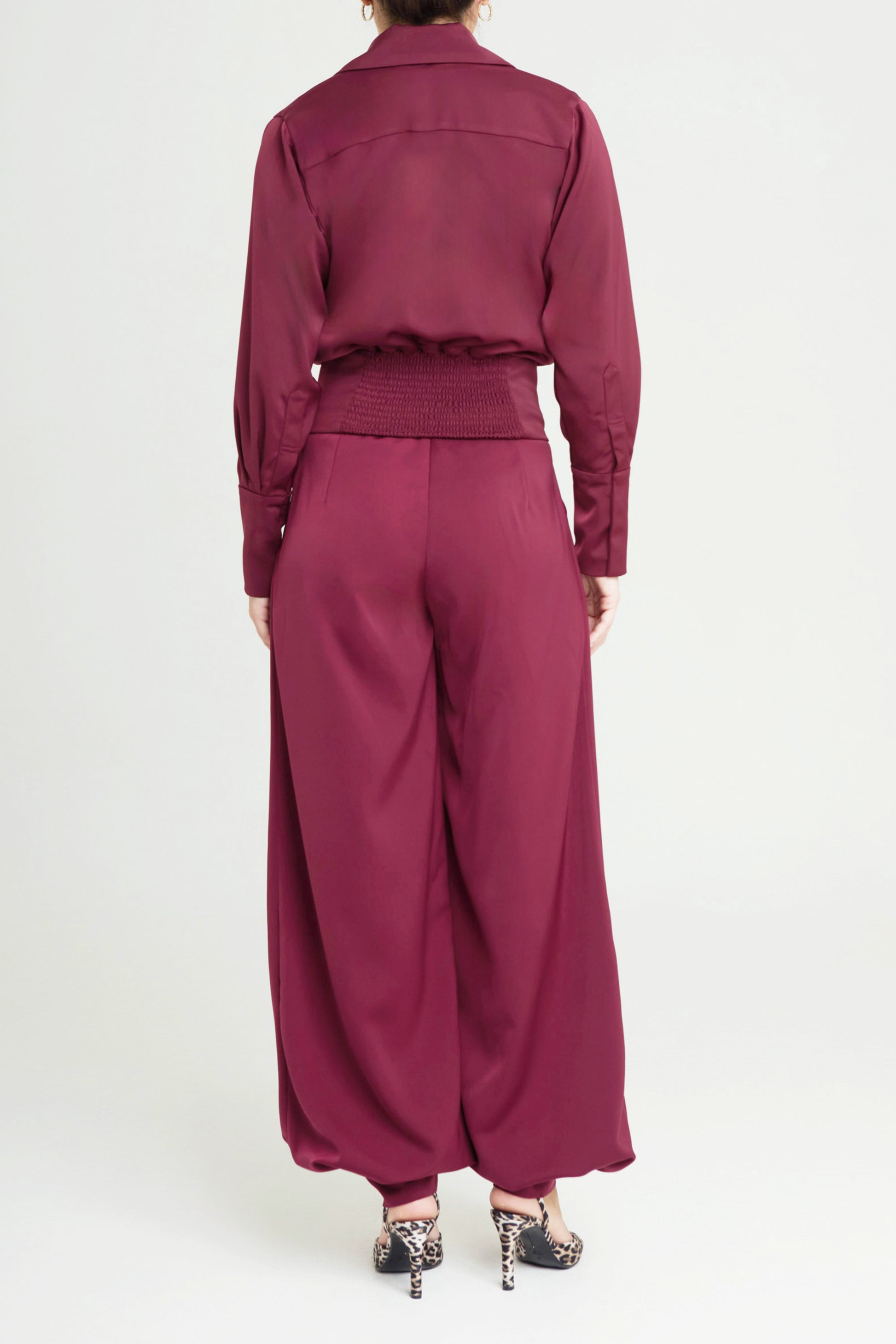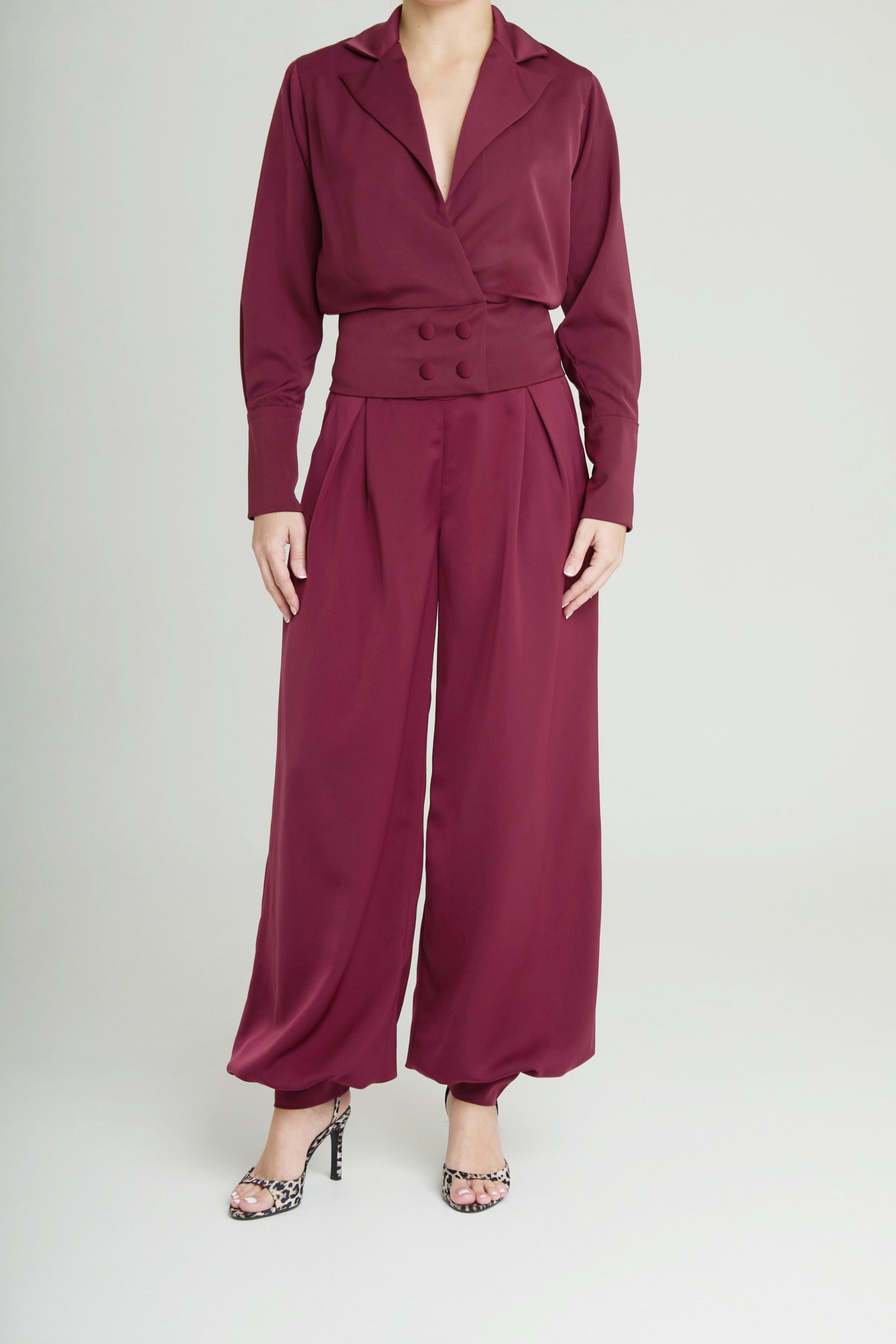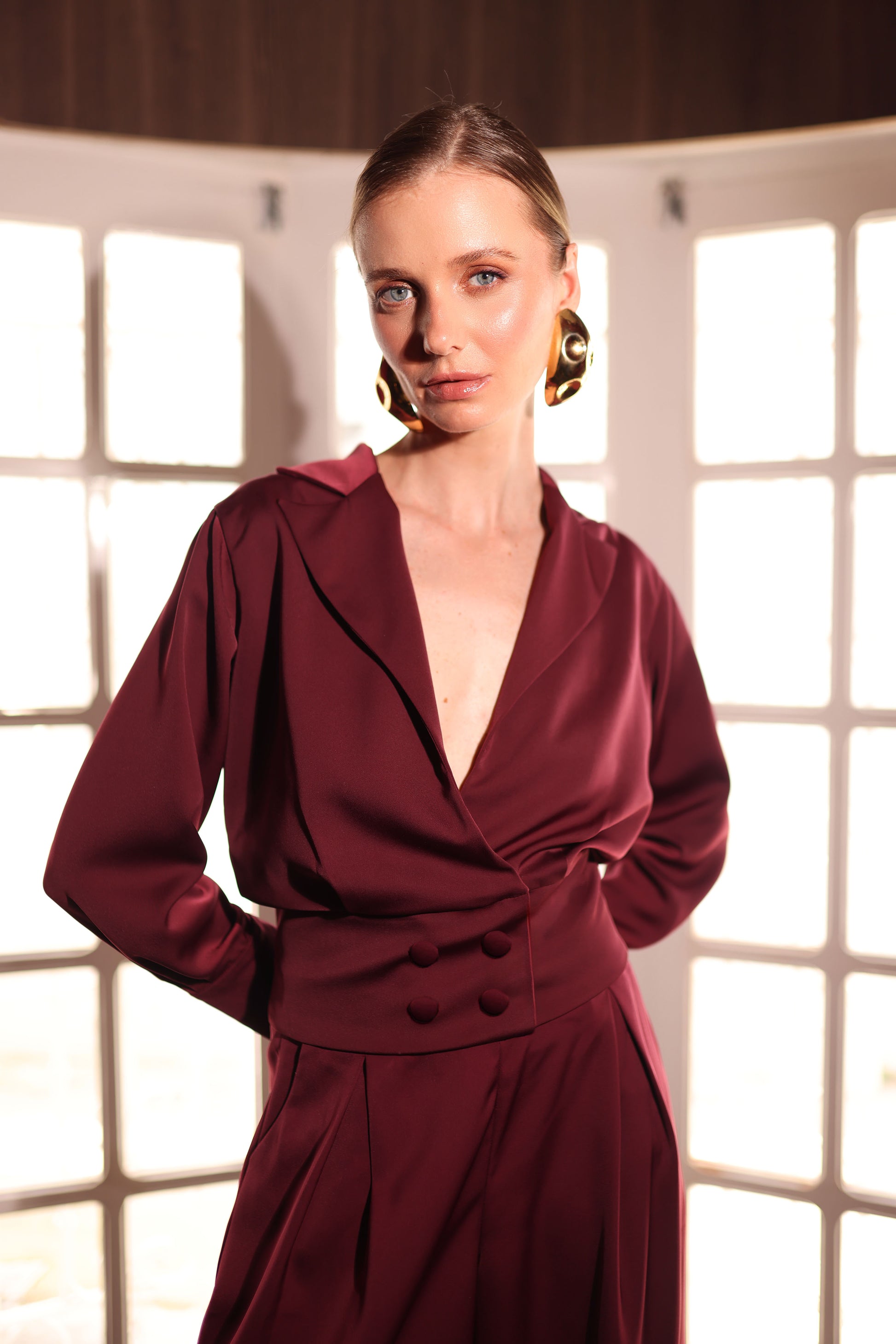 Blusa hecha en un tejido fluido con un acabado satinado, trae un cuello solapa tipo sastre y un cruce que crea una línea limpia y elegante en el escote. Lleva una pretina ancha estructurada con botonadura forrada que define y estiliza la cintura, y elastico en el posterior para un mejor fit.