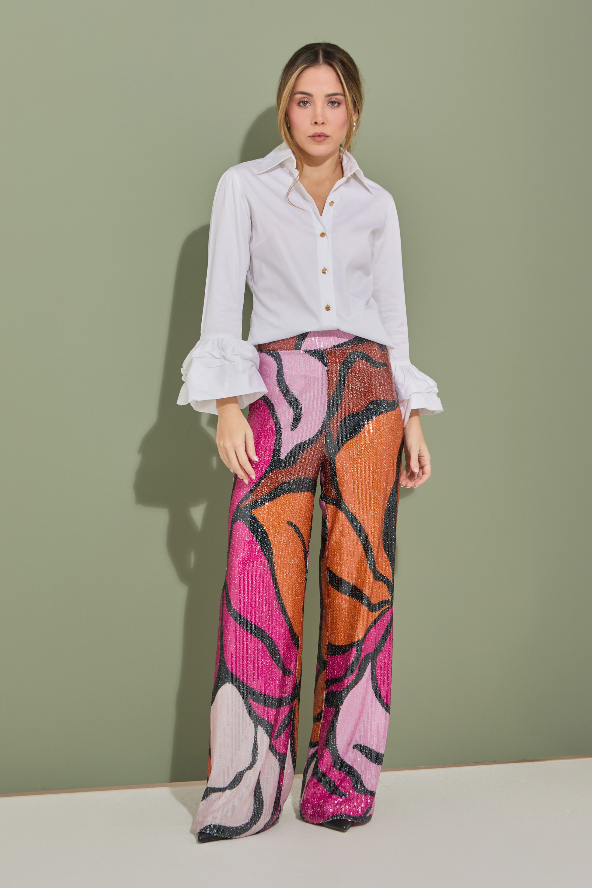 Un pantalon bota ancha de tiro alto hecho en lentejuela con nuestro estampado exclusivo. Arma tu look con cualquiera de nuestros tops, el Aziz para un look clásico, el Kyra para un look atrevido, y el Mara para un look elegante y sofisticado.