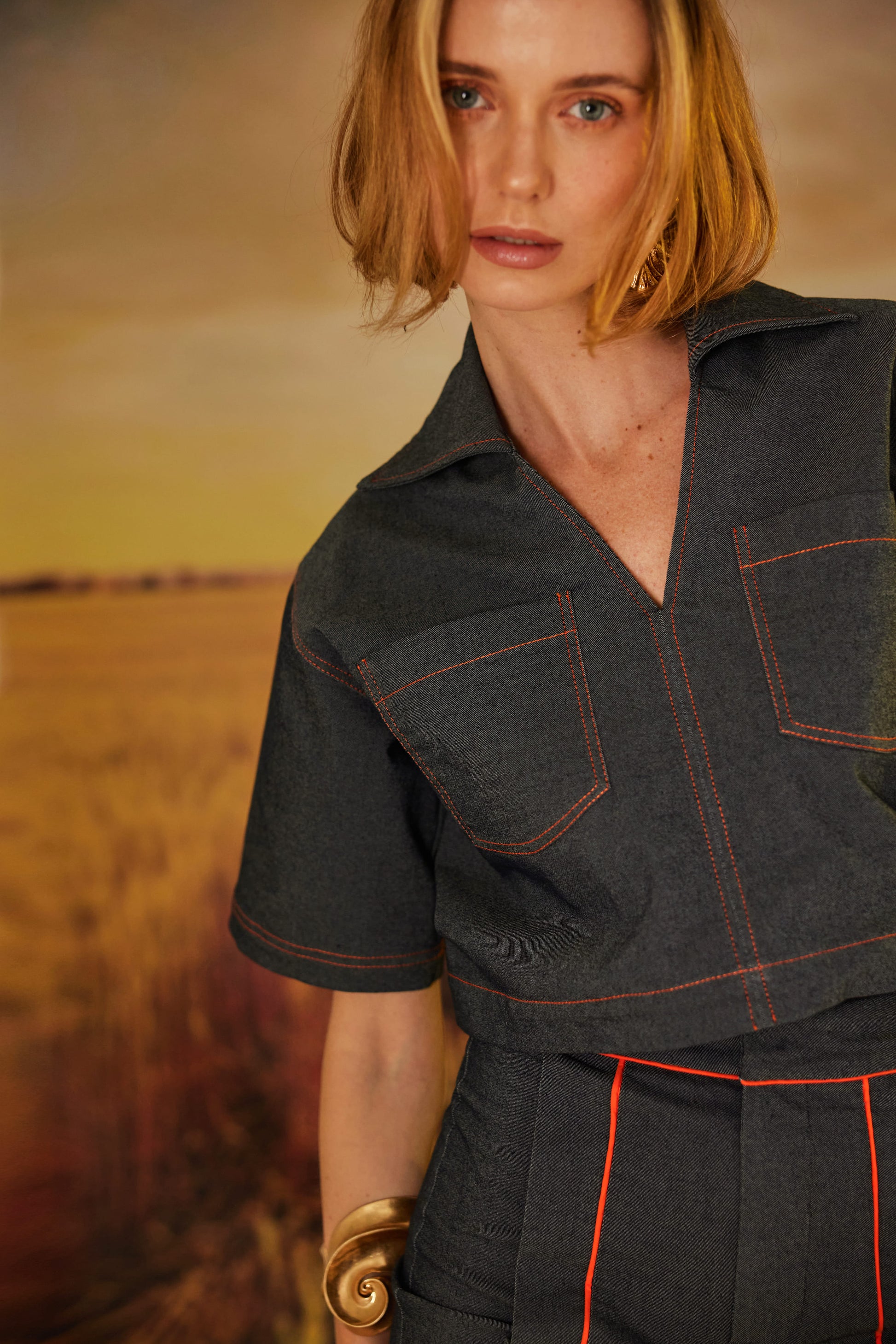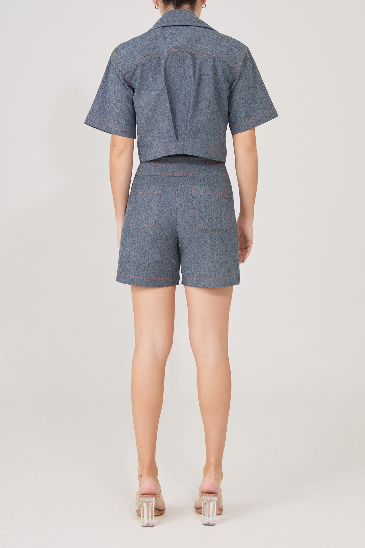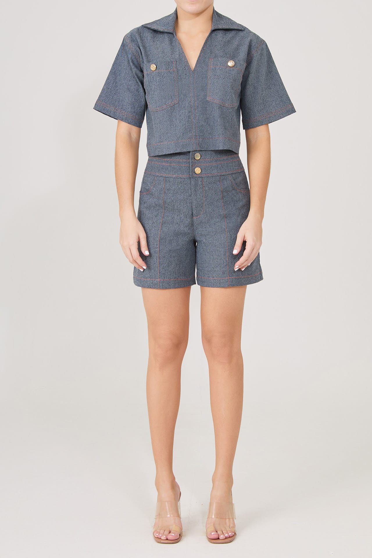 Un set juvenil y casual con detalles de pespuntes naranjas, y nuestros botones dorados insignia. El top tiene una horma ancha con manga en A y bolsillos delanteros, el short tiene una horma suelta con doble pretina y bolsillos sobrepuestos.