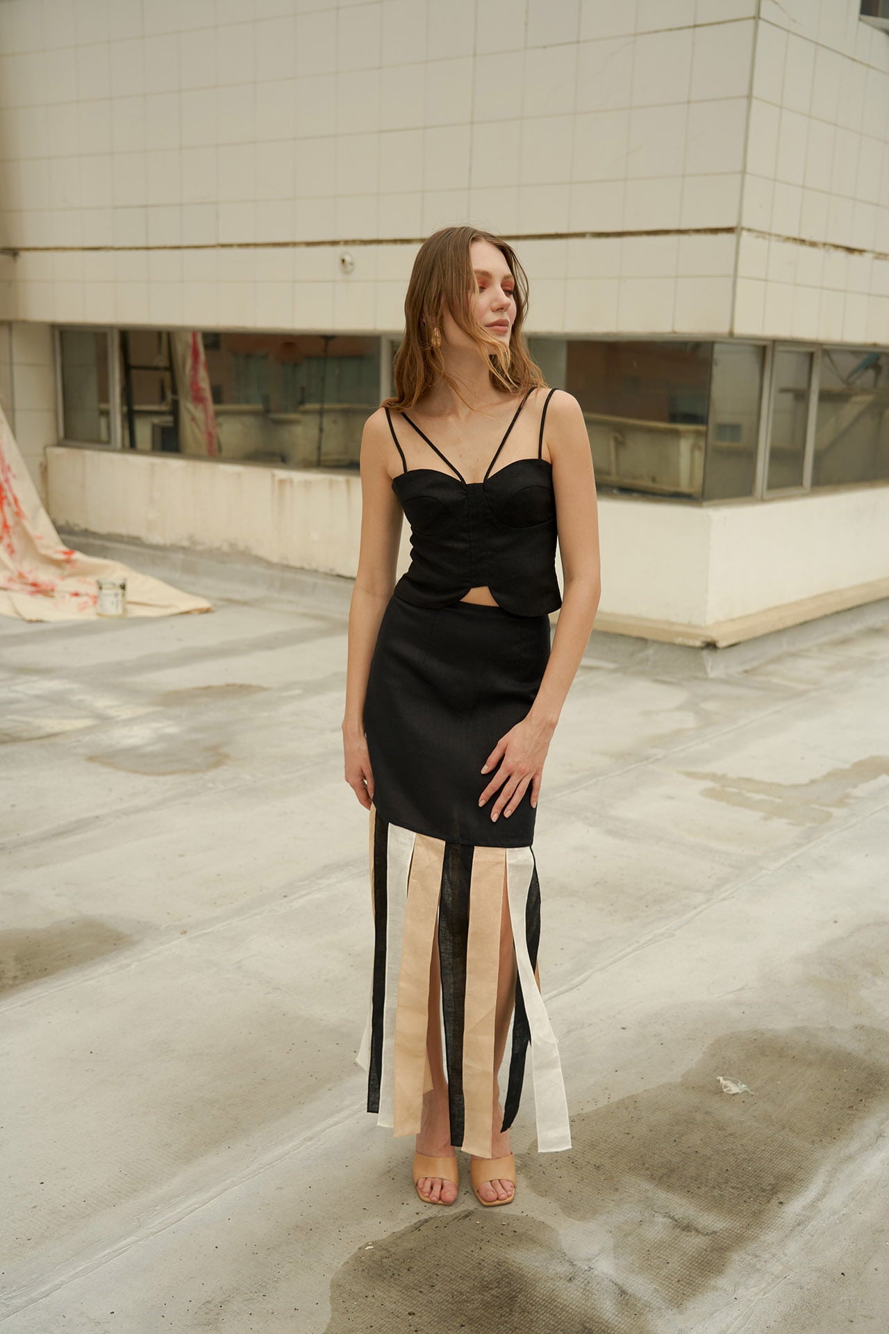 Un set de falda tipo lápiz con falda de tiras sueltas de colores combinados, y top tipo bustier negro con escote corazón, espalda ajustable y corredera desprendible.