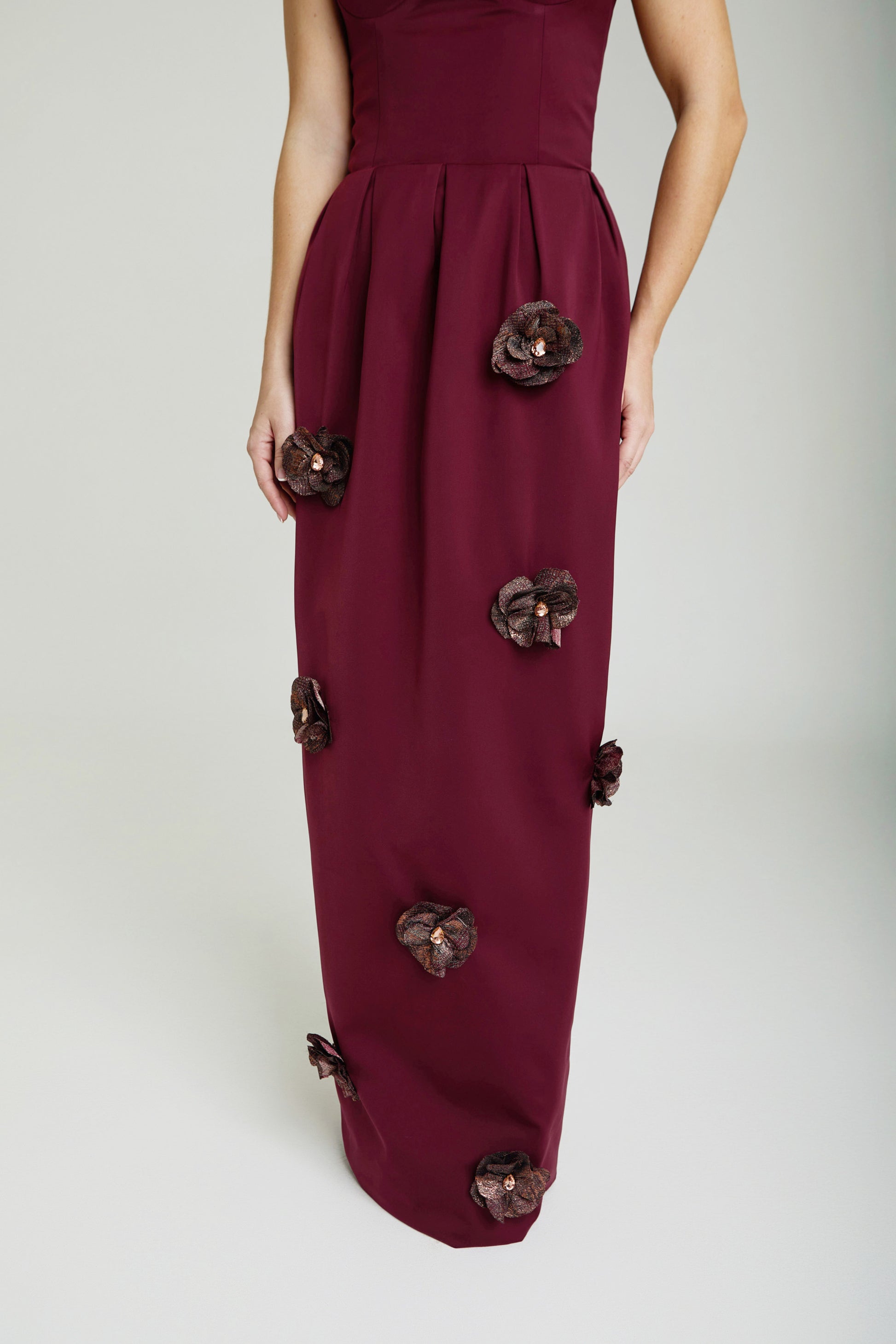 Elegante vestido de noche burdeos con un corsé estructurado, adornado con delicados detalles florales hechos a mano a lo largo de la falda y una discreta abertura en la parte posterior.